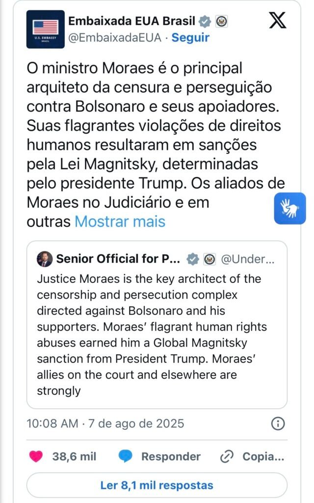 Ontem (7), a Embaixada dos EUA no Brasil traduziu comentário do secretário de diplomacia pública Darren Beattie, ameaçando autoridades do Judiciário brasileiro que contribuam com Moraes. “Os aliados de Moraes no Judiciário e em outras esferas estão avisados para não apoiar nem facilitar a conduta de Moraes. Estamos monitorando a situação de perto”, disse o comunicado do diplomata, acusando o ministro de “censura” e “perseguição” contra Bolsonaro.